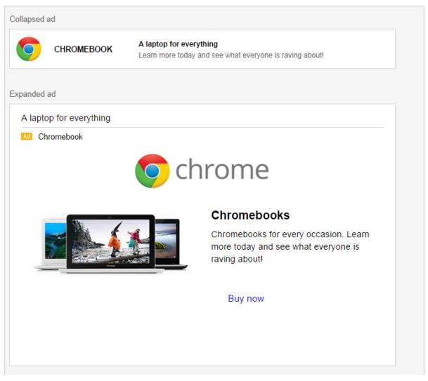 Naudojamas 144×144 logotipas, 15 simbolių antraštė, 25 simbolių tema, 100 simbolių aprašymas, išplečiamas vaizdo skelbimas 300×200, 1024 simbolių produkto ar paslaugos aprašymas, 20 simbolių nuorodos mygtukas su raginimu veikti ir papildomas antraštės paveikslėlis 630×200.